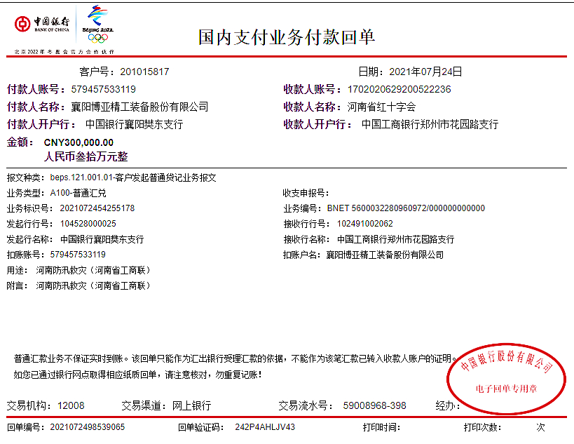 7月17日以來,河南省遭遇極端強降雨,多地遭遇嚴重洪水內(nèi)澇災(zāi)害,給人民群眾生產(chǎn)生活帶來極大損失,嚴峻形勢引起全國各地高度關(guān)注。一方有難、八方支援!在這一特殊關(guān)鍵時刻,博亞公司于7月24日向河南省紅十字會捐款30萬元,以實際行動表達對災(zāi)區(qū)人民的誠摯慰問,略盡綿力幫助災(zāi)區(qū)人民渡過難關(guān)。